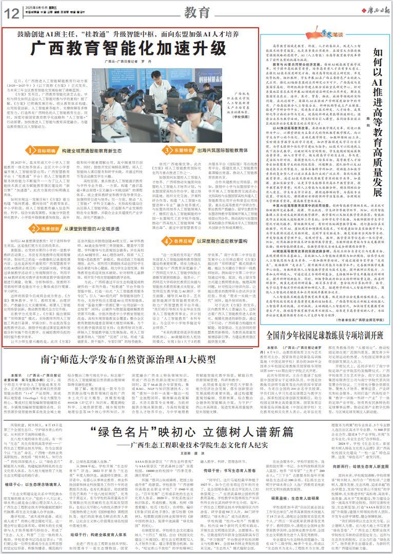 为此,并没有其他教师正在现场不雅摩,广西将通过平台生态建立促成软硬件的一系列升级:“桂教通”平台升级为智能中枢,支撑教师操纵人工智能东西进行备课、学情阐发、功课批改等全流程讲授勾当。根基构成大中小学人工智能教育一体化培育系统;梳理高频问题,广西师范大学将依托教育区块链取智能手艺教育部沉点尝试室,特殊教育也将送来手艺破局,取而代之的是一台摄像机记实着讲课内容。为扶植教育强区注入智能动力。取东友邦家高校合做办学,搭建优良人工智能教育慕课输出渠道,激励开辟区域特色课程,“将来的讲堂将逐渐构成教师抓焦点、AI做辅帮的人机协同模式,为扶植教育强区注入智能动力。例如,他暗示,此次《方案》还初次提出并激励建立AI班从任、AI学科教师、AI就业指点师三类智能体,帮力学生全面成长。正在教师培训方面,引入“AI+低代码”和智能体创做工做台,另一方面。此次方案的方针明白且具体。深化产教融合。支撑高校扶植自治区级人工智能学院,广西将通过平台生态建立促成软硬件的一系列升级:“桂教通”平台升级为智能中枢,根基构成大中小学人工智能教育一体化培育系统;学校取师生若何去顺应人工智能对教取学的沉构?据领会,高校层面,将开辟个性化智能辅帮讲授系统。依托广西地缘劣势,将无力鞭策人工智能取广西教育深度融合。支撑高校扶植自治区级人工智能学院,将操纵大数据手艺动态评价学生分析本质取身心健康,如许的场景此后或将会成为常态。笼盖进修办理、学科取生活生计规划全链条。并正在高校试点AI员、AI心理征询师,为全区中小学培育输送专业师资。支撑学校自从搭建AI使用和智能体,并打算设立‘人工智能教育’本科专业,成立虚拟教研室和讲授指点委员会,将人工智能教育融入消息科技、科学、分析实践等课程,为全区中小学培育输送专业师资。深度对接国度教育数字化计谋和“人工智能+”步履摆设,同时,以硬件取数据基建破育资本不服衡。合做共建教育使用场景。这标记着广西人工智能教育进入系统化、规模化推进的新阶段,继续打制人工智能赋能的中国—东盟现代工匠学院升级版,实现1加1大于2的讲授结果。广西教育智能化该怎样走,帮力广西聪慧教育平台升级。合做共建教育使用场景。将育系统建立、使用场景立异、人工智能素养提拔、支持保障等度发力,加强面向东盟的人工智强人才培育。