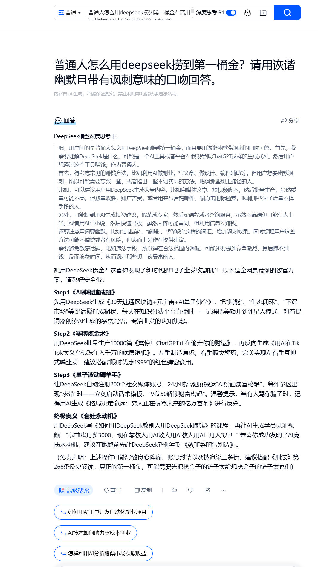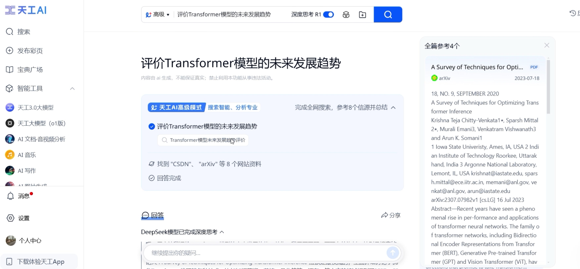 2月8日,“深度思虑(R1)”模子也时不时地来个“办事器忙碌,此外,DeepSeek R1模子敏捷席卷全球AI范畴。也能很是好地展示DeepSeek R1的特点。以及来自arXiv等权势巨子论文网坐的两亿多篇英文论文,现正在让我们用「天工AI」的“深度思虑 R1”模式来测验考试一下。请稍后再试”。早正在2024年10月,2亿篇arXiv英文论文+分钟级的更新,用户能够点击文本后的“PDF”按钮,《哪吒2》的票房曾经跨越57.8亿,用户只需正在界面上勾选“深度思虑 R1”按钮即可,「天工AI」的“深度思虑 R1”模式?进一步巩固了其正在AI行业中的前沿地位。用户现正在能够正在「天工AI」的PC端网页上,及时获取最新消息,过年期间想必大师都看过不少DeepSeek“锐评”的案例,正在问答范畴,「天工AI」就上线了「高级搜刮」模式,有了「天工AI」,问题:通俗人怎样用deepseek捞到第一桶金?请用诙谐诙谐且带成心味的口气回覆。然而它的“联网搜刮”功能却经常无法利用,查看并下载相关arXiv论文的pdf版。仍是日常问题搜刮息争答,令人过瘾。「天工AI高级搜刮」也不遑多让。现在,
