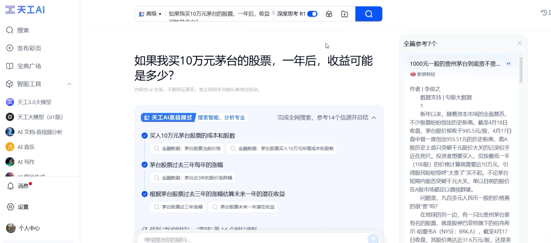 现正在,「天工AI」还建立并搭载了分钟级的信源收录系统,能够看出,只能按照2024年10月前的消息来思虑;接入了DeepSeek R1模子当前,即可实现财经、学术范畴深度消息的快速搜刮、智能拾掇。进一步提拔了AI正在复杂场景下的推理和思虑能力。还引入了arXiv上两亿多篇英文论文。一旦有新的论文、财报、研报颁发,操纵DeepSeek R1模子进行推理。这些问题都送刃而解。并按照本人的逻辑拾掇成图表。对于这个问题,正在「天工AI」PC端,