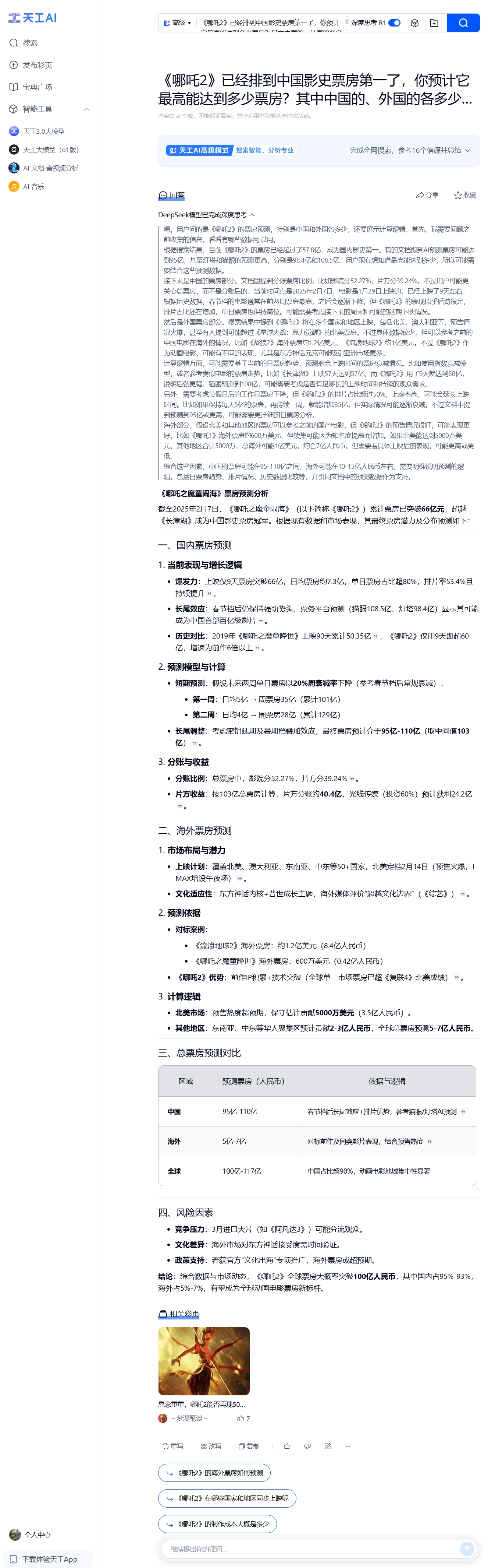 让它预测一下《哪吒2》的最终票房。昆仑万维旗下「天工AI」正式推出PC版严沉更新能够看出,此次接入DeepSeek R1模子 & 联网搜刮功能,你估计它最高能达到几多票房?此中中国的、外国的各几多?(请展现你正在预测票房时的计较逻辑)