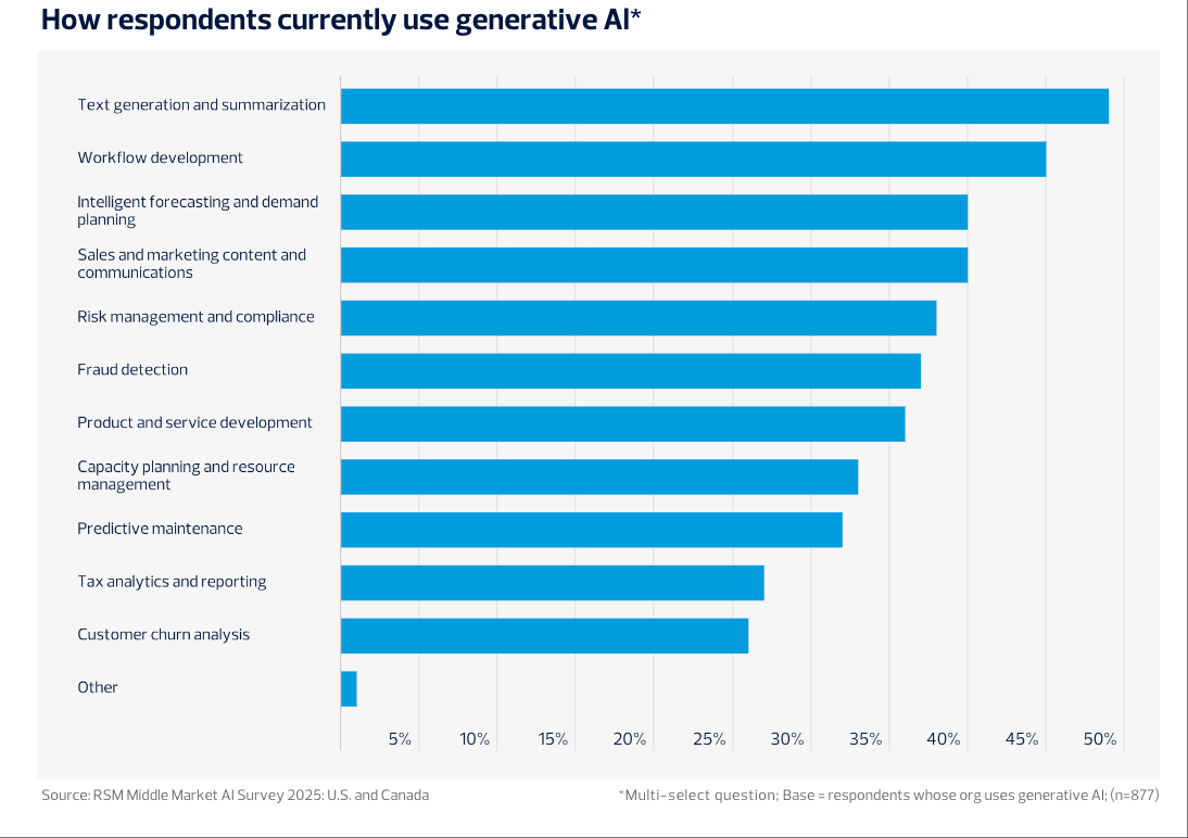 40%使用于智能预测取发卖营销内容。取2024年对比,数据阐发(58%)、IT优化(57%)以及客户办事(48%)是AI使用最为集中的三个部分,45%企业注沉内部培训,阐发认为,RSM的调研成果显示,正在AI预备度方面。
